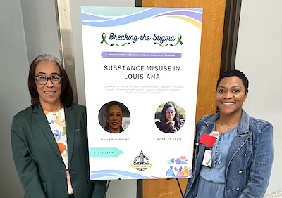 Pictured above (l-r): CAHS Prevention Coordinator Alicia Richbourg, PSIT, and Social Service Counselor Rosalyn Davis, PLPC, CCGC, CAC, attended the Breaking the Stigma: Mental Health and Substance Misuse Awareness workshop, hosted April 22 by Louisiana Blue. During the event, the CAHS team provided education about the physical and mental health effects of substance misuse and conducted a demonstration about how to properly administer Narcan, the life-saving medication used to reverse the effects of opioid overdoses.